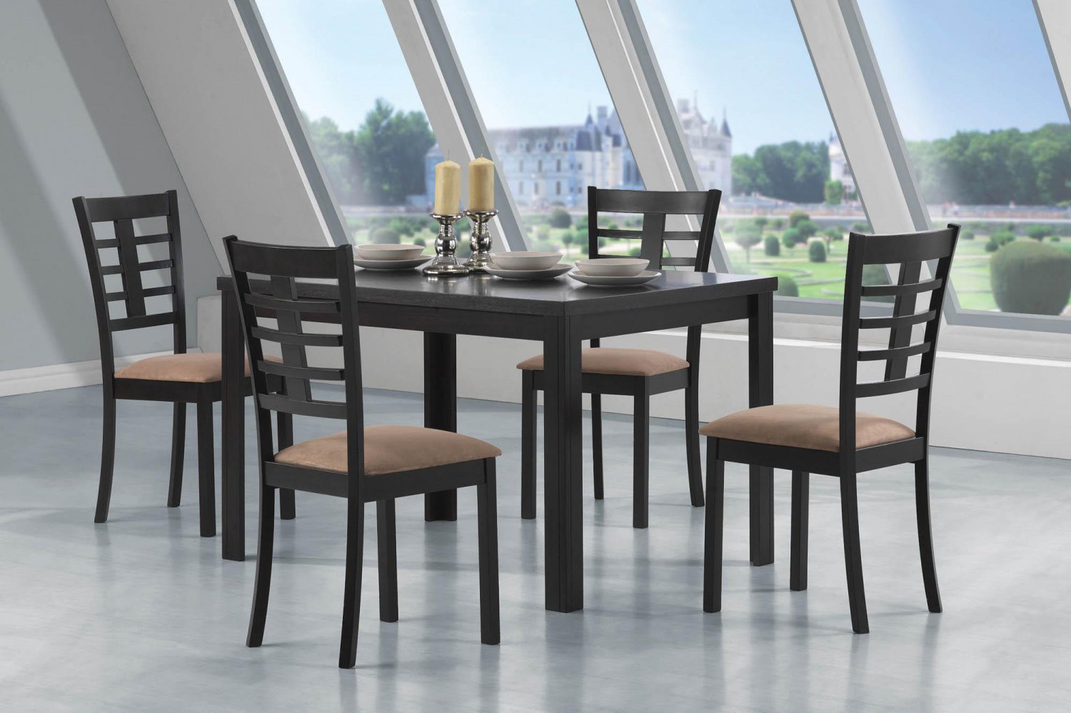 5 pc. dining set in espresso finish. Table and 4 chairs. RTA set made of rubberwood. Table dimensions are 45 x 28 x 29H. Dining chair dimensions are 16.25 x 17.25 x 37.6H. Padded seat is a light tan microfiber. Seat height is 18. Set ships in 3 cartons. ... Read Content