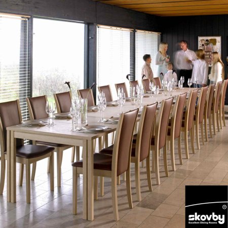 Patented Skovby #24 dining table in a unique design and the most flexible and stable in the market. From six up to twenty persons! Underneath the dining table top three extension leaves are stored – and the dining table can be extended to 14 seatings. ... Retrieve Content
