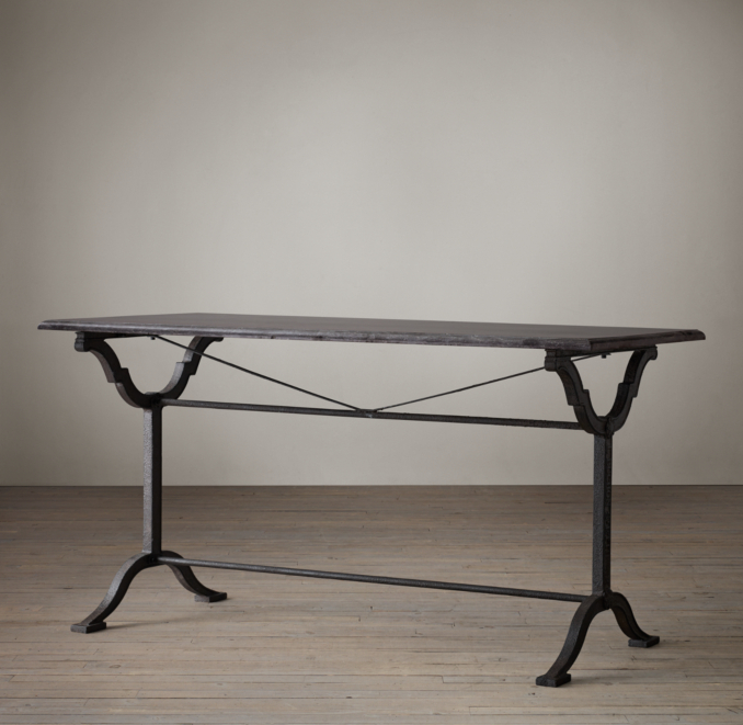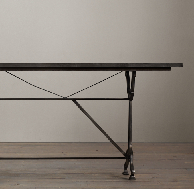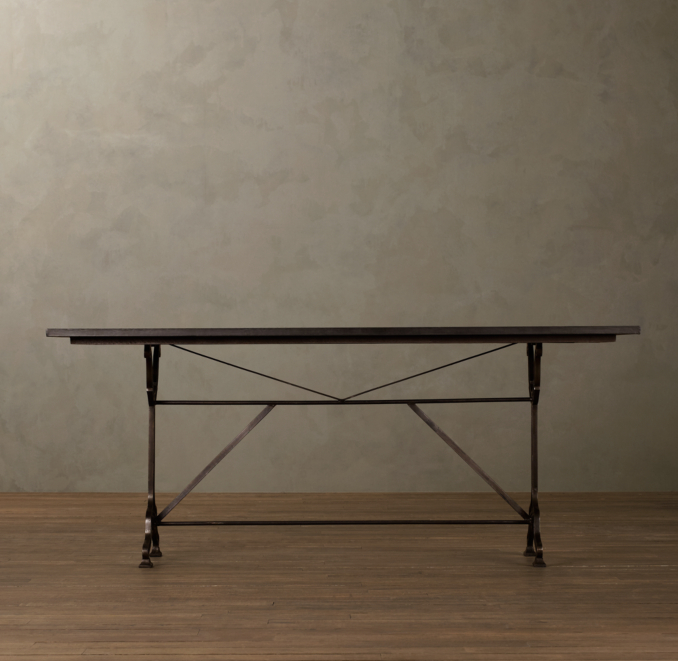 Restoration Hardware's Factory Zinc & Cast Iron Rectangular Dining Table:Modeled after the base of a Victorian-era sewing machine, our trestle table's legs are cast of iron, which splay into ogee curves at the bottom and are braced by slim stretchers. The broad metal-clad top has a hand-applied ... Read Document